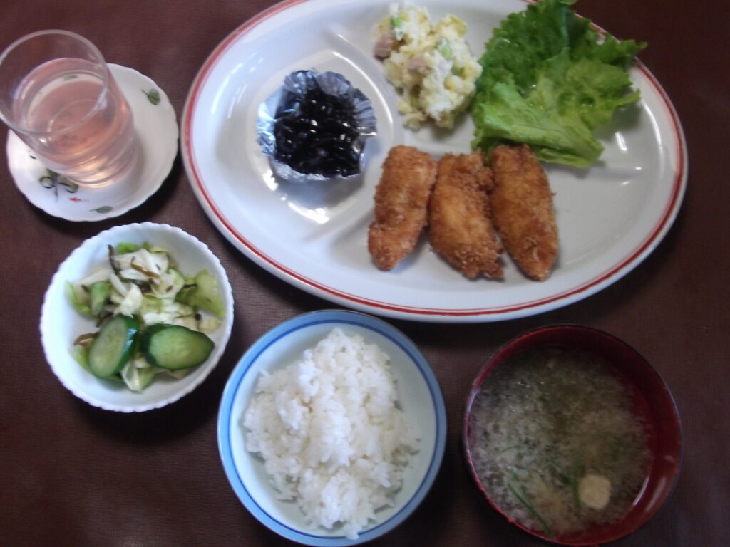 ささ身フライはカラッと揚がっていて美味しかったです。ポテトサラダの枝豆が美味しかったです。味噌汁にとろろが入っていて珍しくて美味しかったです。今年の新米がとても美味しい味でした。マメに暮らせるようにという諺のように良い黒豆がでました。漬物はキュウリとキャベツと特に昆布が美味しかったです。シソジュースはシソの香りが広がって美味しかったです。