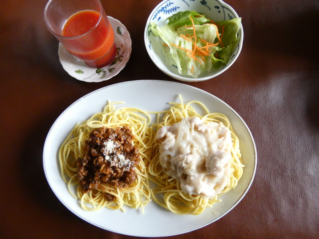 今日は久しぶりにスパゲティです。挽肉とタマネギ、椎茸の旨味が溶け込んだミートソースと、とろけるチーズと鶏むね肉、玉ねぎ、エノキタケが入ったホワイトソースの2種類でどちらも美味しくいただきました。