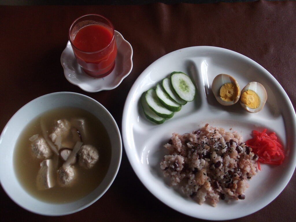 昼食 赤飯と鶏団子汁 Posted on 2025年9月11日 by aunkuru 11 9月 今日はミニトマトジュース作りの日でした。赤飯やあっさりとした鶏団子汁を煮卵や作り立てのミニトマトジュースと一緒に美味しく頂きました。 aunkuru 白身魚(カレイ)フライとオクラの素揚げ 肉じゃがと鮭のホイル包焼