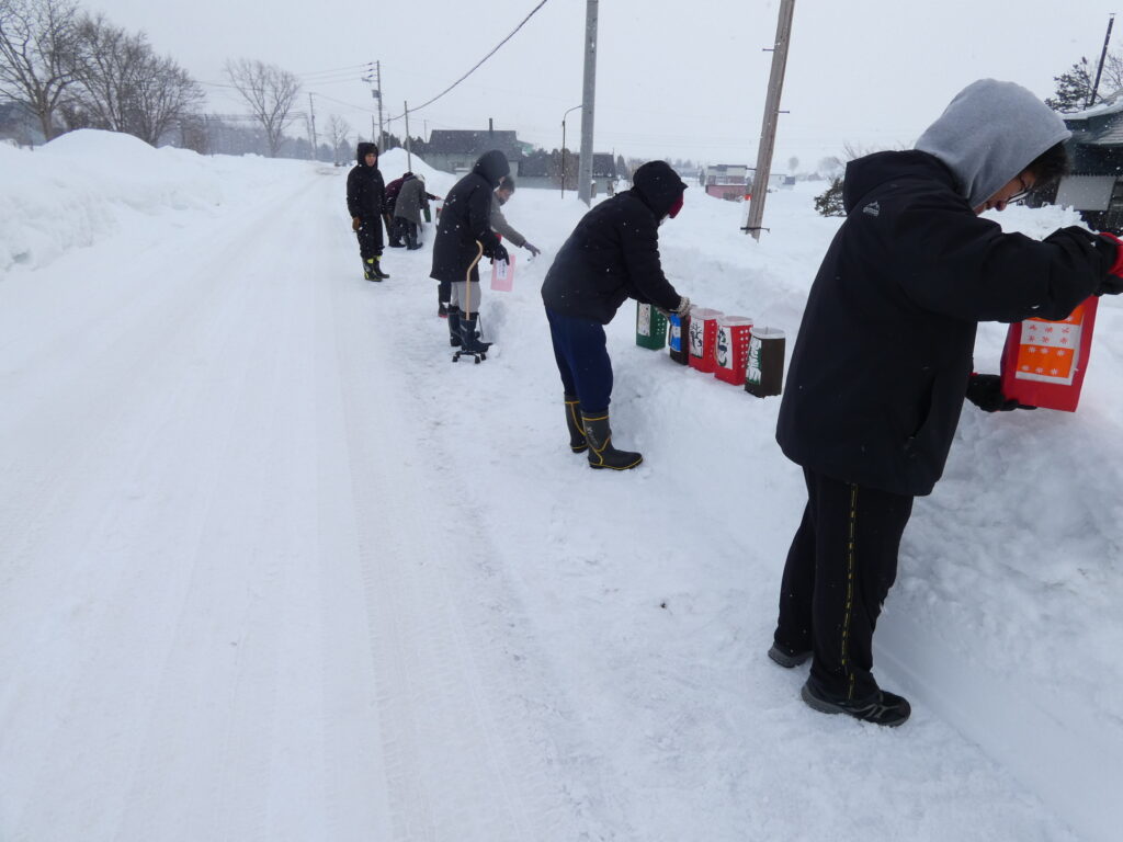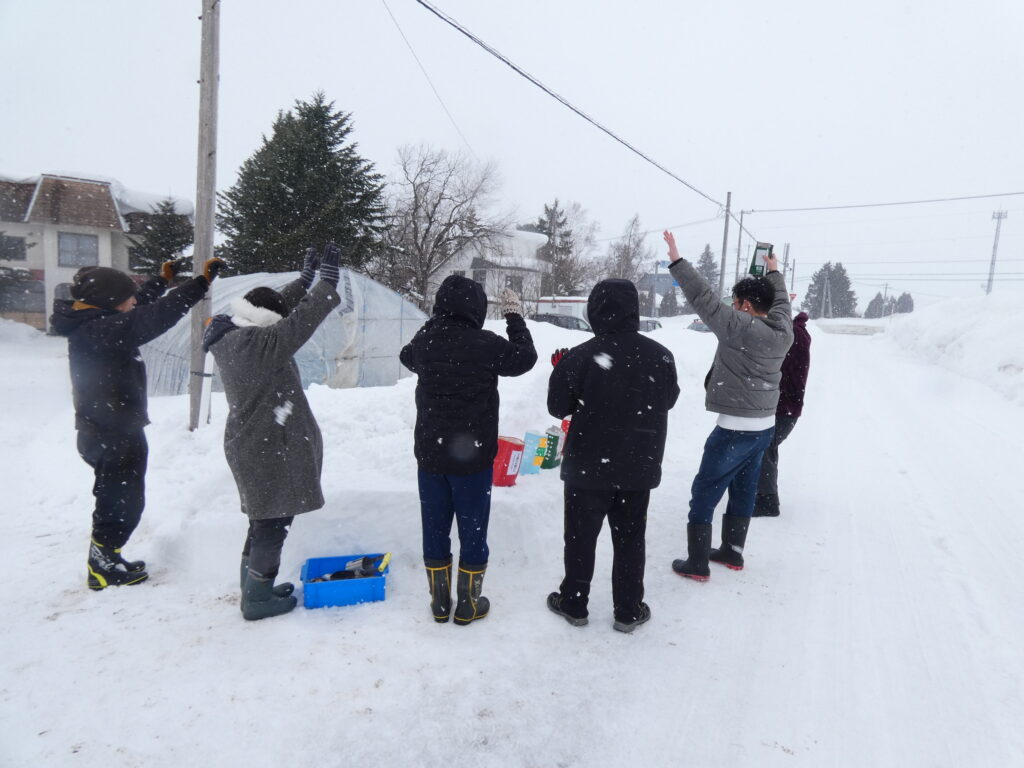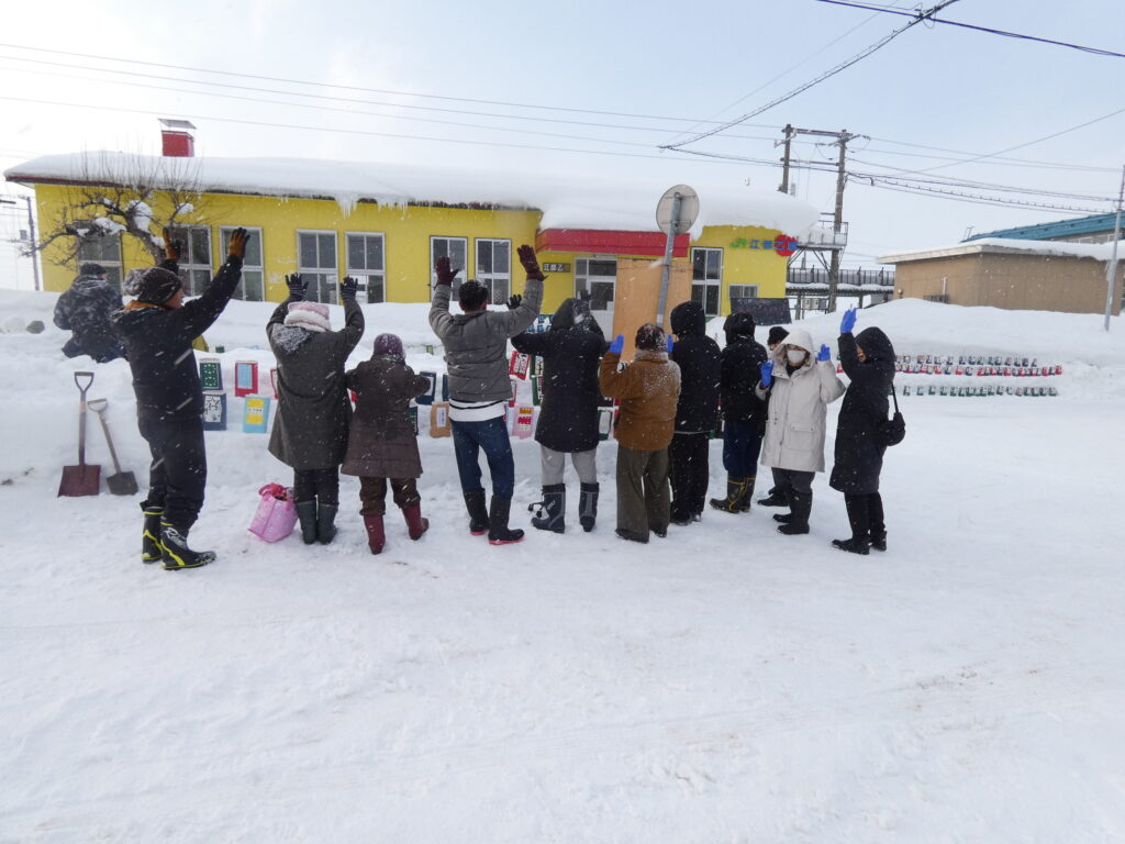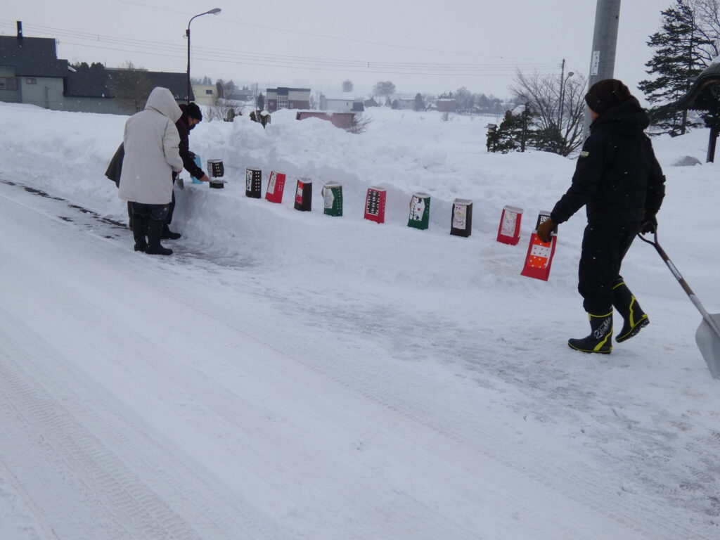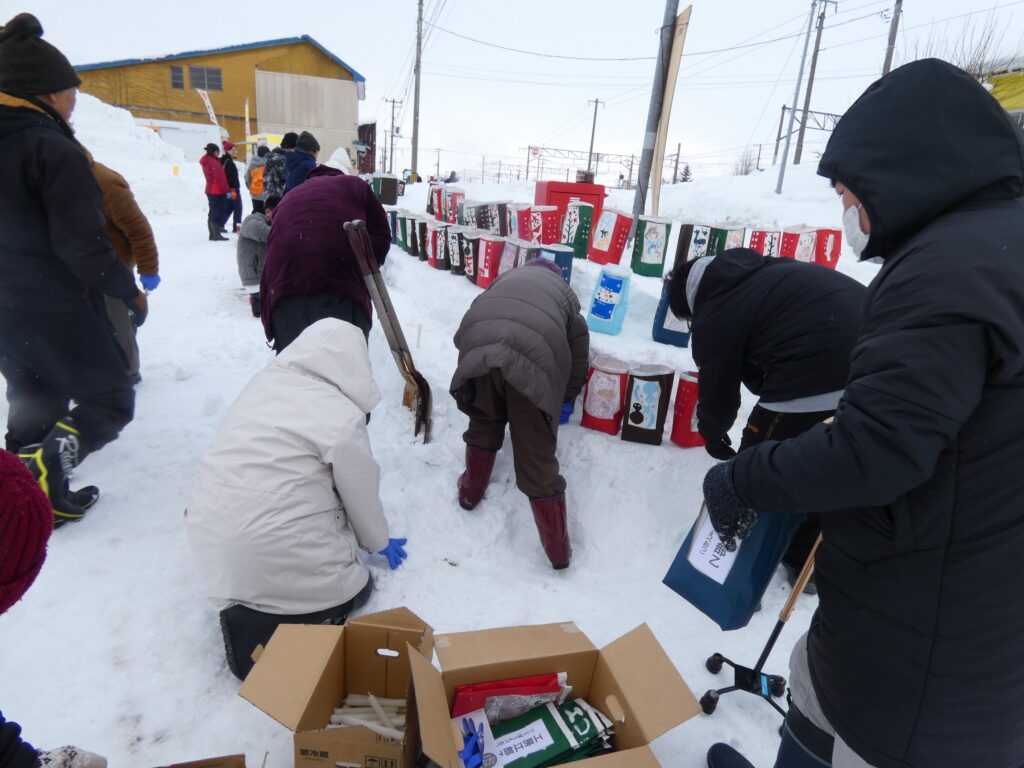 工房江部乙の広報活動の一環として滝川市で行われる紙袋ランタンの作成と展示をしています。工房江部乙の入口と江部乙きたあかりものがたりが行われる江部乙駅前に展示をしてきました。紙袋ランタンの中に重しとなる雪を入れてろうそくを立ててきれいに並べてみんなで万歳しました。