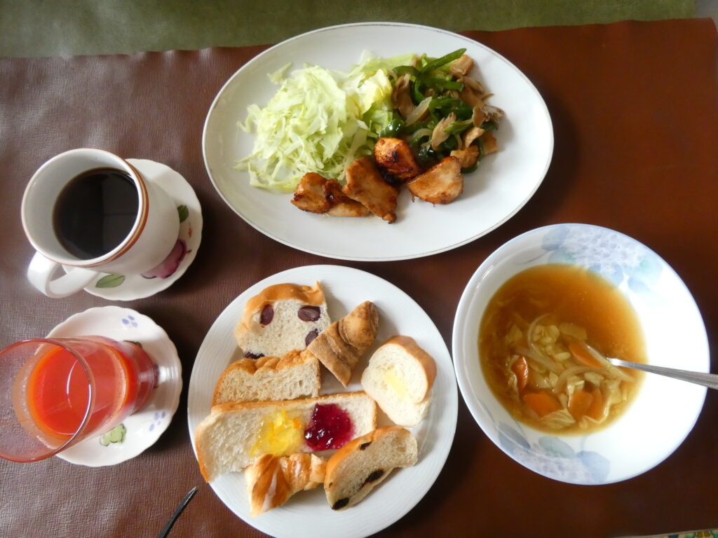 工房江部乙で生産しているきな粉を衣に使った鶏むね肉の唐揚げとちくわとピーマン、舞茸などを使った炒め物を食べました。野菜がたくさん入ったカレー風味のスープやシャッキリしたレタスとキャベツのサラダも美味しかったです。今日も挽きたて豆を使って淹れたコーヒーや私たちが生産しているミニトマトジュースも美味しかったです。