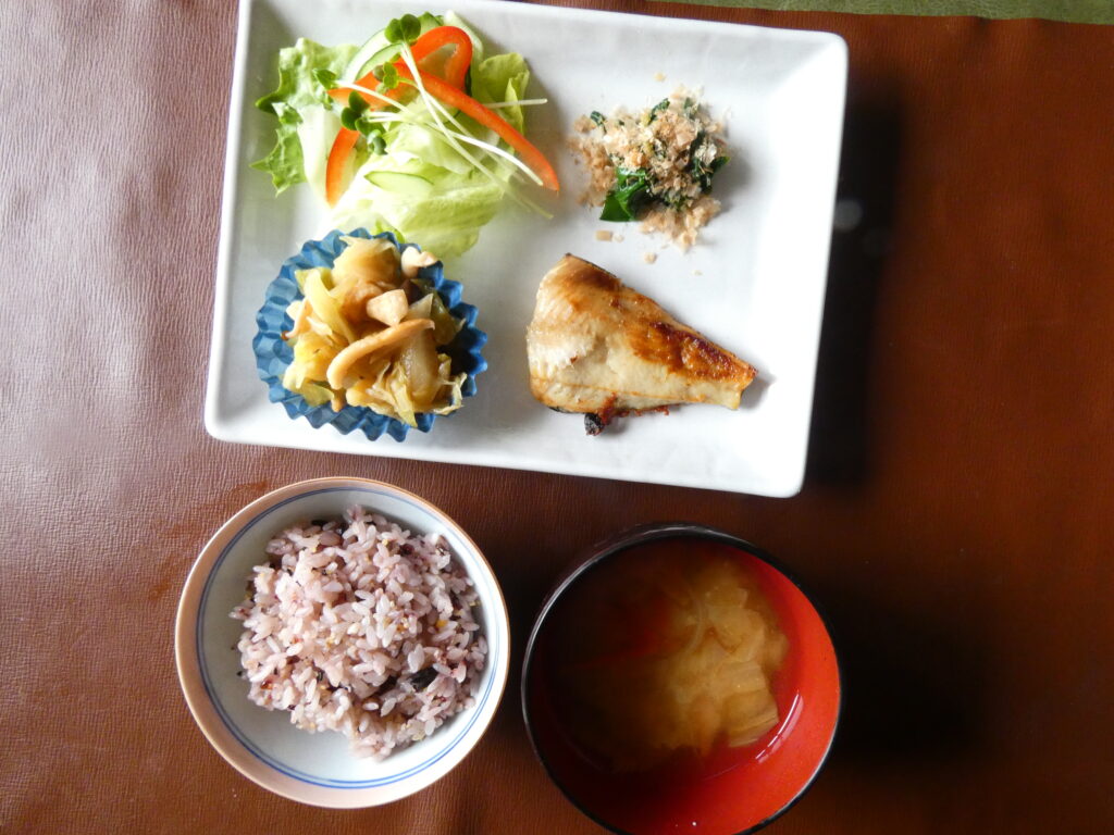 ホッケは焼き加減が美味しかったです。野菜サラダはパプリカとレタスとカイワレ大根がミックスされて美味しかったです。ほうれん草におかかがかかっていて美味しかったです。キャベツと切り干し大根の煮物は甘い味付けで美味しかったです。十五穀米は栄養価の高いご飯で美味しかったです。ニンジンと白菜と玉ねぎの味噌汁も美味しかったです。