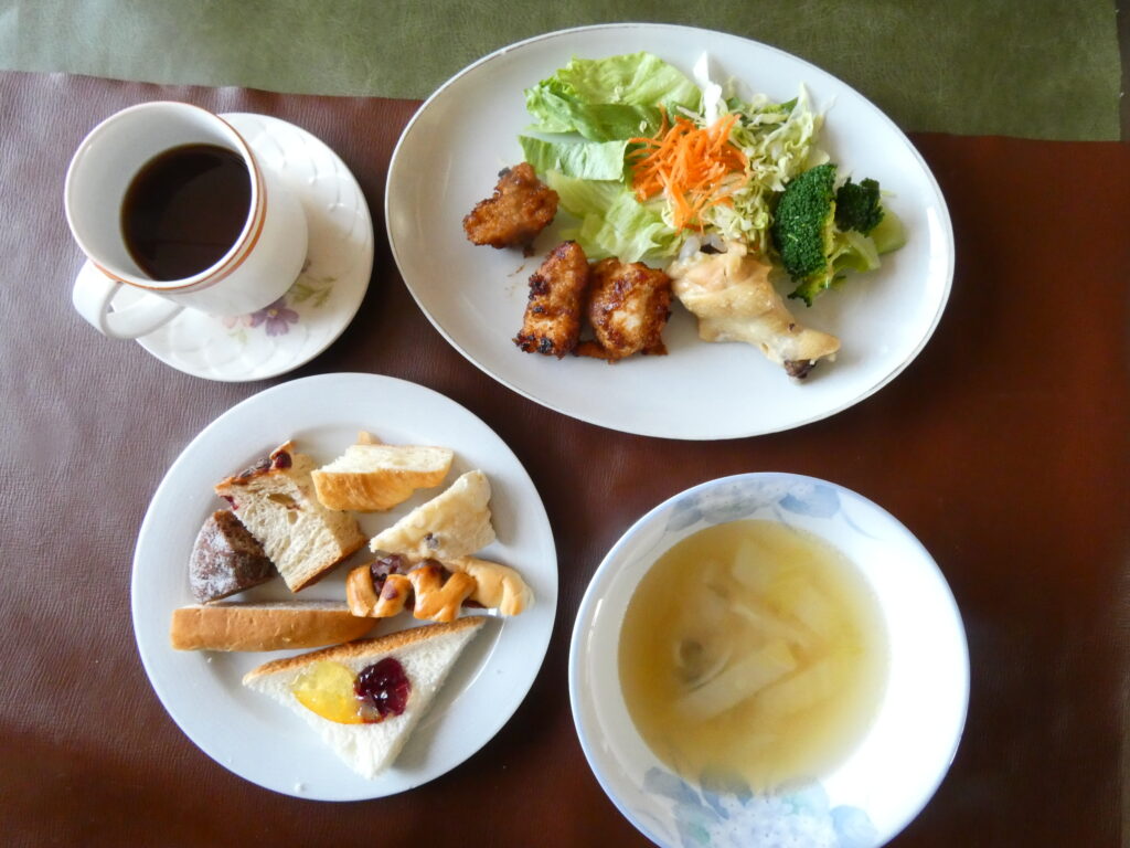 今日はコーヒーとパンの日。鶏むね肉の唐揚げと手羽元の蒸したのがあって美味しい味でした。野菜サラダはレタスとキャベツと人参とブロッコリーもあって美味しかったです。野菜スープは薄味で白菜とブナシメジが入って美味しかったです。パンはいつもの7種類のパンで食パンと菓子パンとクロワッサンなどがあって美味しかったです。コーヒーはいつものように深い味わいでした。