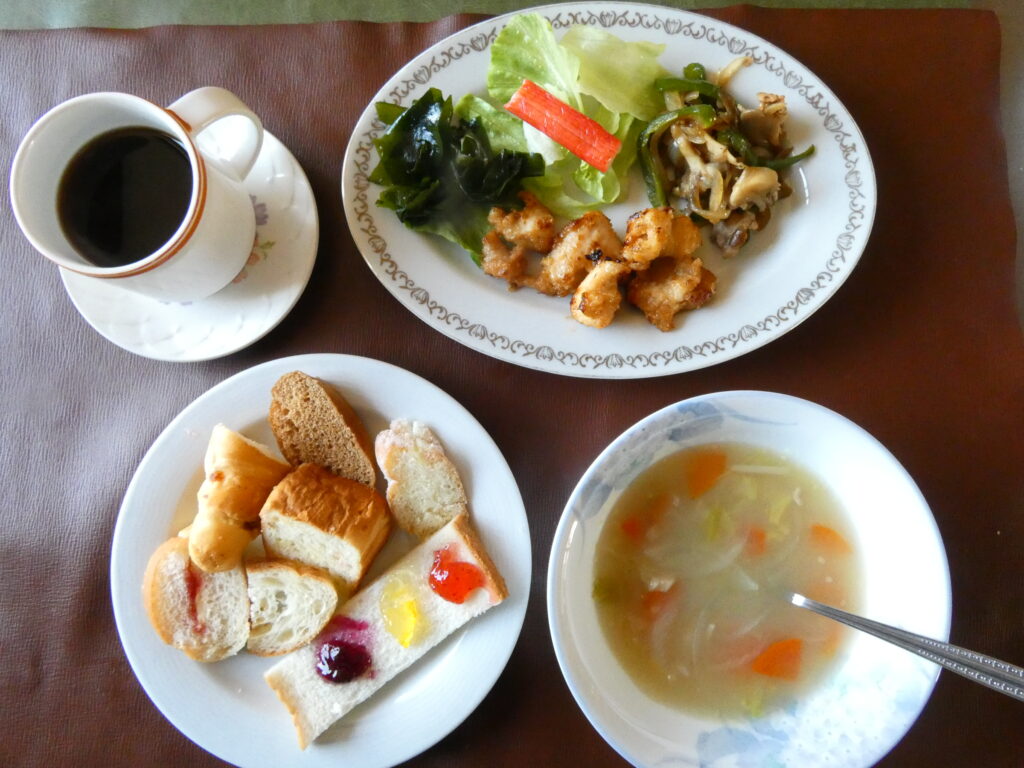 毎週火曜日はパン食の日。7種のパンと淹れたてコーヒーがとても美味しいです。そして唐揚げの日でもあります。今日はきな粉が衣の鶏むね肉のからげでした。副菜の豚肉とたっぷり野菜の炒め物はゴマ油がほんのり効いて、スープはクリームコンソメ味で野菜も多く美味しかったです。