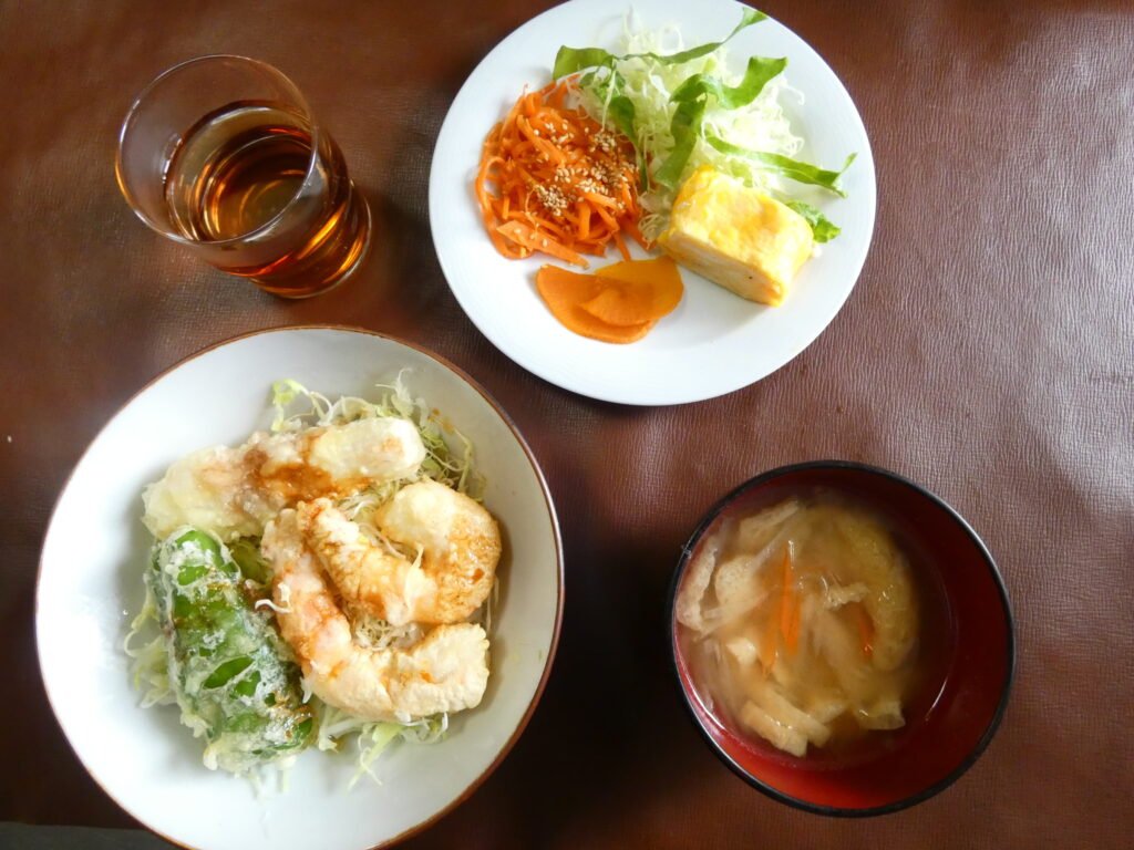 海老、ちくわ、ピーマンがのった天丼がとても美味しいです。だし巻き玉子もほんのり甘く美味しいです。