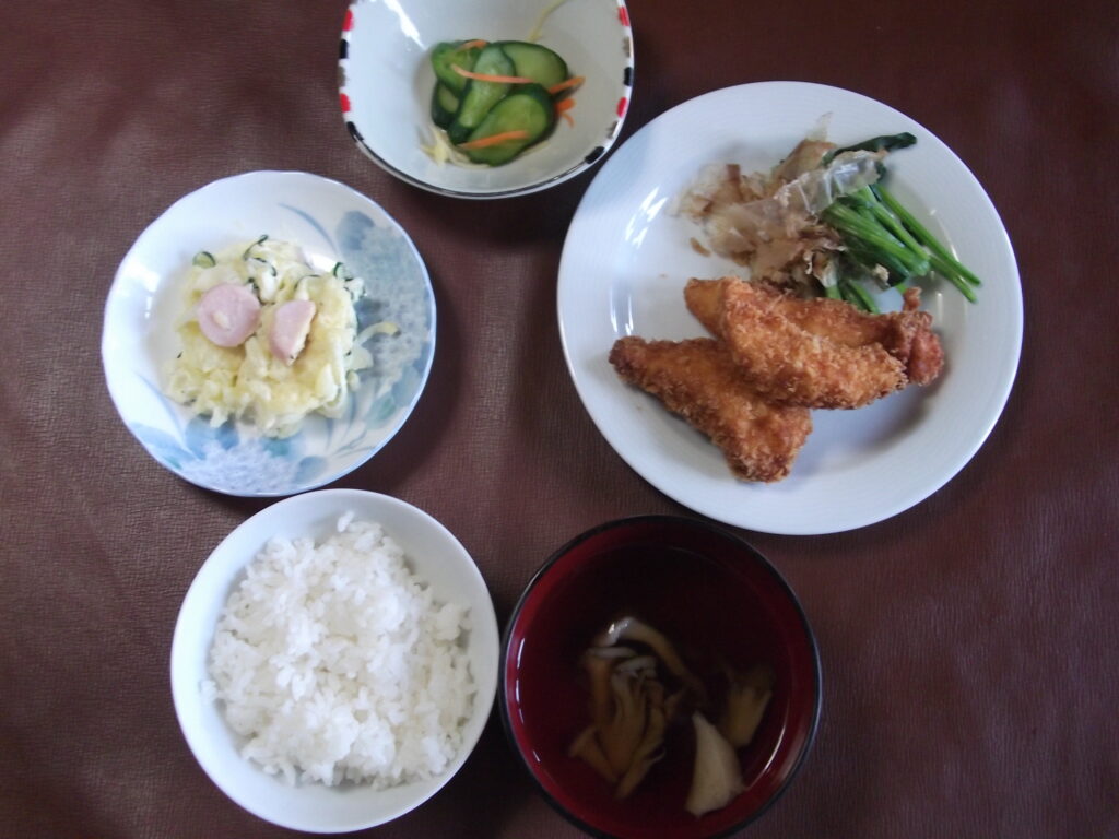 サクッと揚がった鶏ささみフライで食欲が出ました。美味しいポテトサラダと浅漬けにも自家栽培のキュウリが入り今日も美味しい昼食でした。